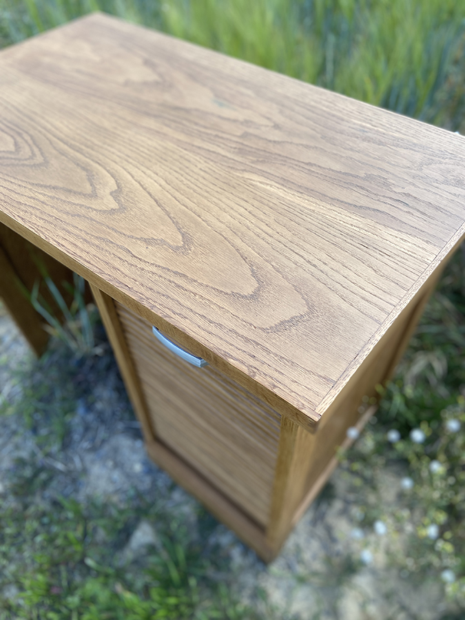 Le bureau à rideau a été totalement nettoyé et décapé de son ancienne finition pour retrouver le bois brut. Le placage du plateau a été réparé, réencollé, rebouché, détaché et teinté pour s’accorder à la couleur naturelle du piétement. L’ensemble a été huilé avec soin pour protéger dans la durée.