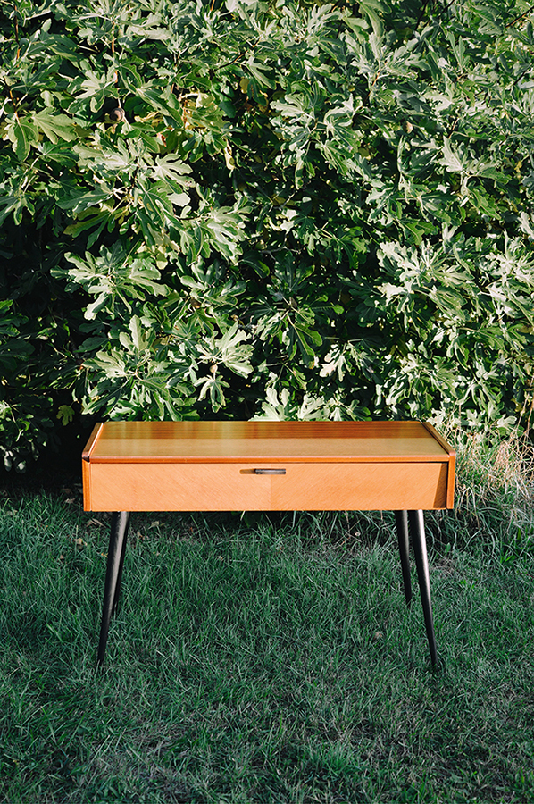 En bois massif et plaqué, le meuble est solide et ses finitions précises, avec un design caractéristique de la période : des pieds compas élancés, une poignée métallique industrielle, les accords des teintes des bois sélectionnés…