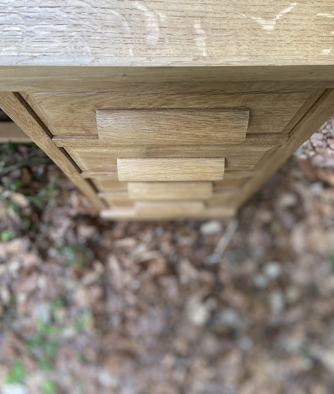 Pour celui à tiroirs, un décapage a été nécessaire pour retirer une lasure grise posée dans les années 1990. Nous avons choisi d’en laisser quelques traces pour renforcer la clarté du bois et souligner ses dessins. Un léger travail sur la structure pour réencoller certains points qui commençaient à fatiguer. Création de nouveaux fonds pour les tiroirs, certes solides mais marqués par les encres et les feutres des générations précédentes. Un ponçage de finition pour revenir à la douceur et de l’huile pour nourrir, protéger et valoriser le chêne clair.